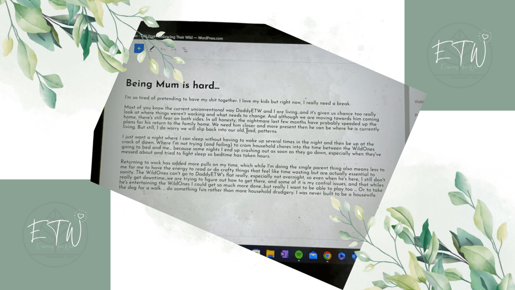 I am still struggling to find balance of chores to fun…and have added work back into that mix too. There is still resentment that while I’m doing the cooking/cleaning etc Daddy and the Wild Ones can play…but now DaddyETW knows how much I am struggling. Together we are trying to find a balance. We haven’t made any firm decisions yet (life is still pretty changeable for the time being within the ETW family) but we are discussing options and ways forward together, which is a big change from me trying to do it alone and feeling like he wasn’t willing to step up further. A lot of our problems were (and still are) communication based…but at least we have recognised that now and are trying to find ways to communicate and hear each other properly rather than making assumptions or jumping to conclusions.