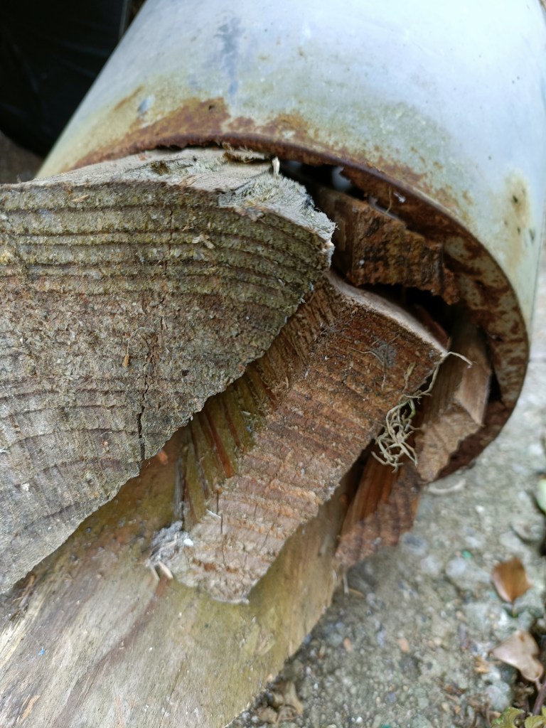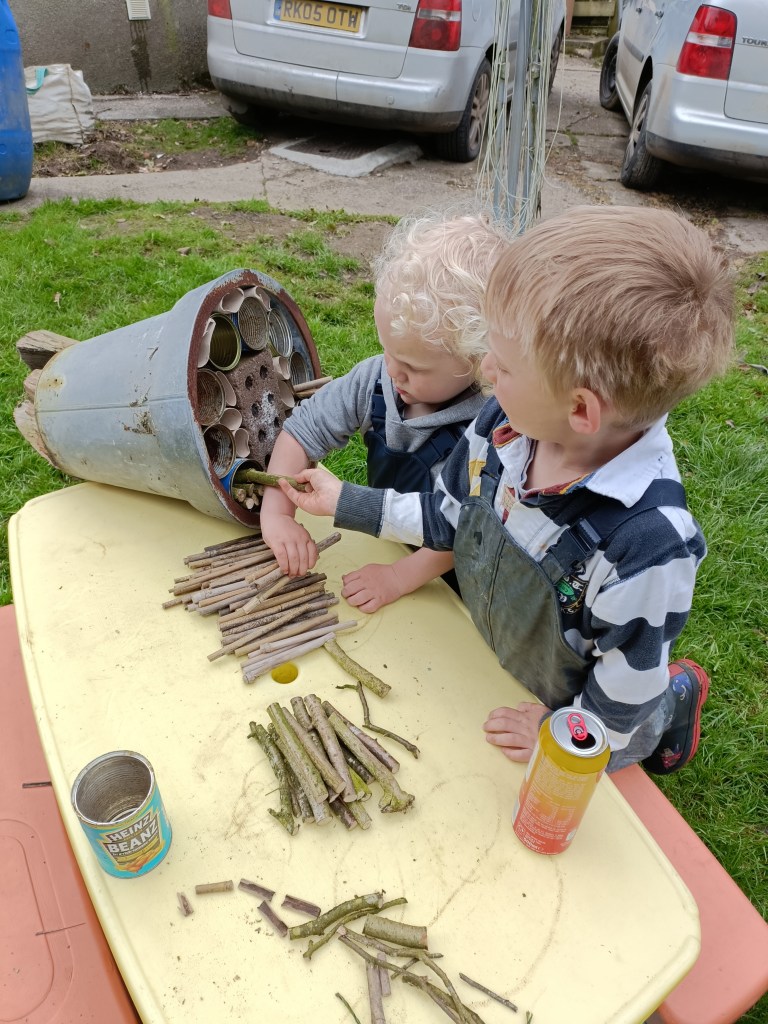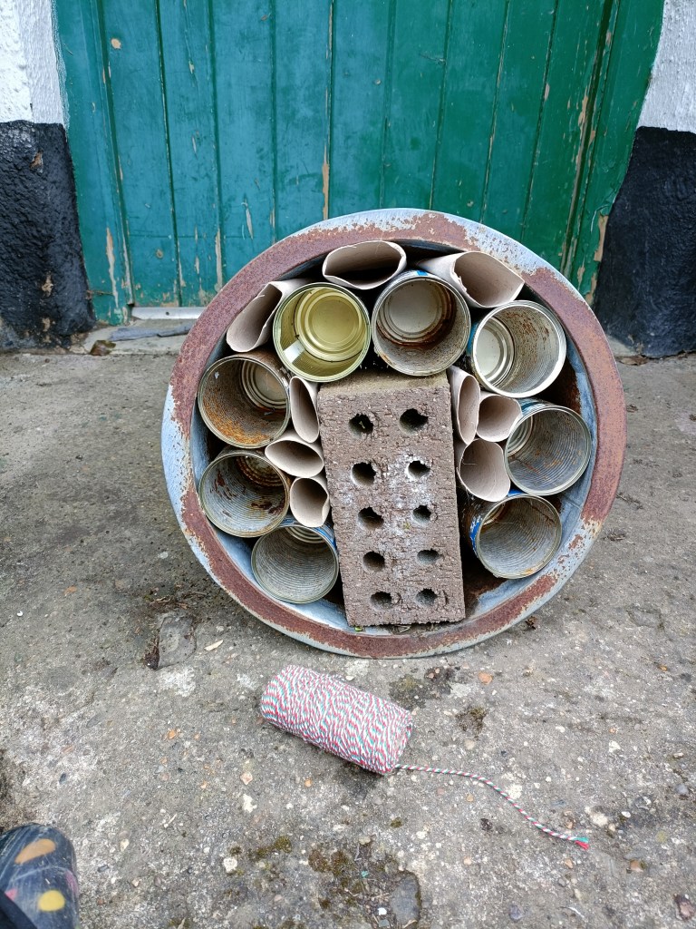 A quick raid of the recycling later and we had the starting blocks for our latest bug hotel. Tins and toilet roll inners at the front and old damp wood from the fire pile at the back.