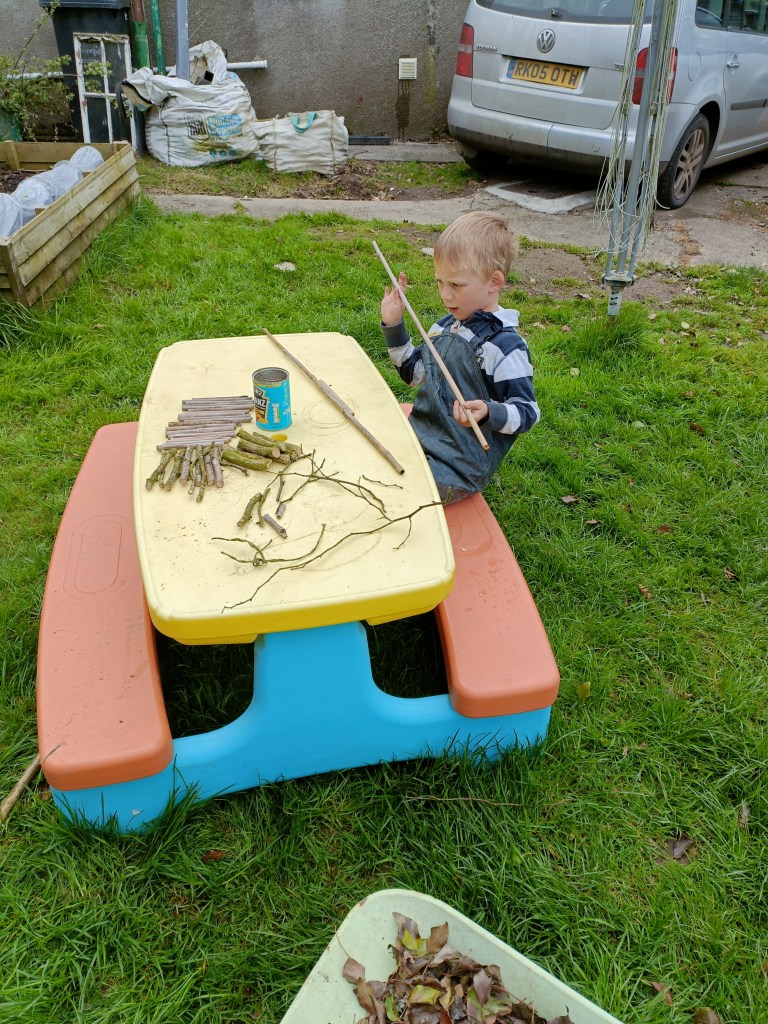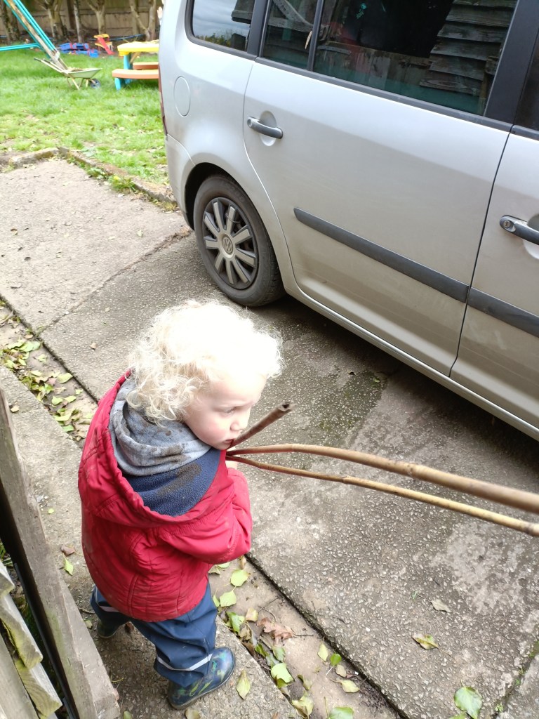 A scout around the garden, and we collected sticks and branches, old leaves, and some rotten bamboo canes that had been left out all winter.
